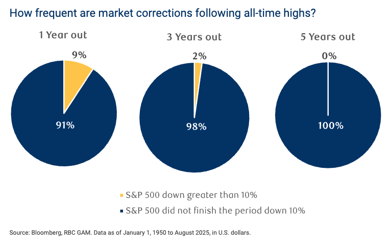 I massimi storici sono frequenti, normali e statisticamente non predittivi di correzioni imminenti. Tre delle fonti più autorevoli della finanza globale - RBC Global Asset Management, Fidelity Investments e Schroders - concordano: nel lungo periodo, restare investiti batte quasi sempre il tentativo di trovare il momento perfetto.