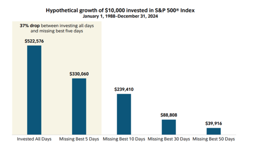 Il problema è che i mercati concentrano i loro migliori rendimenti in pochissimi giorni. Chi resta fuori nel tentativo di “proteggersi” rischia di perdere proprio quei giorni, che fanno una differenza enorme sul risultato finale a lungo termine.
