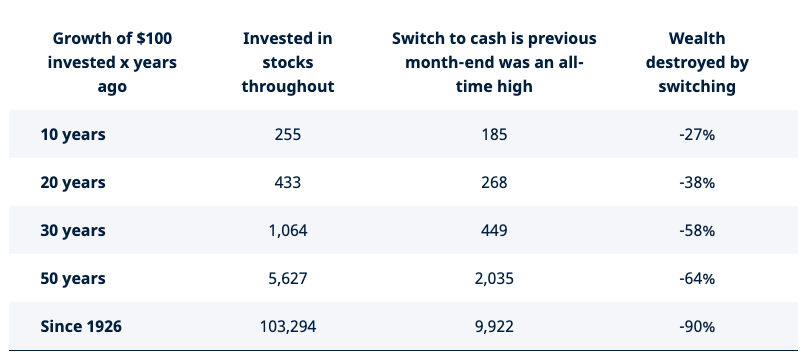 La strategia testata era semplice: “Ogni volta che il mercato raggiunge un massimo storico, vendo tutto e torno in liquidità per un mese. Poi rientro.”